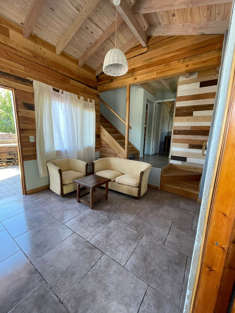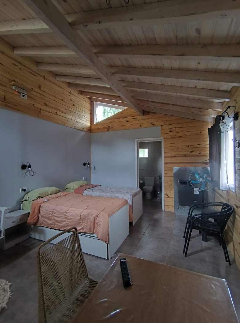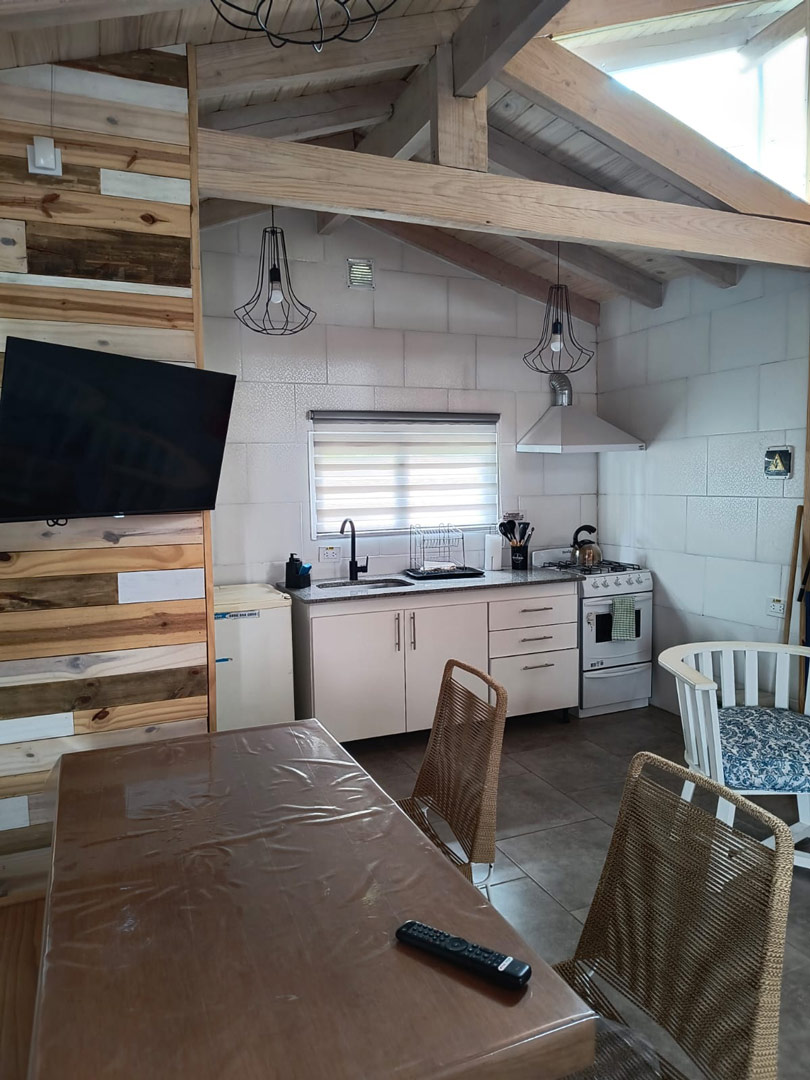 Una cabaña con living comedor cocina, baño deck y un dormitorio hasta cinco personas.