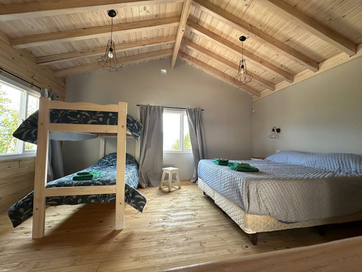 Dos cabañas con living comedor, cocina, ante baño, baño, dos dormitorios, deck o patio hasta seis personas.